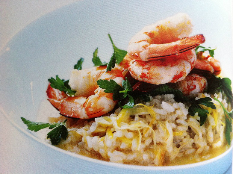 2. Voeg de rijst en bouillon toe. Sluit goed af met een deksel en zet 25 minuten in de oven. Voeg de garnalen toe en zet nog 5 minuten in de oven.