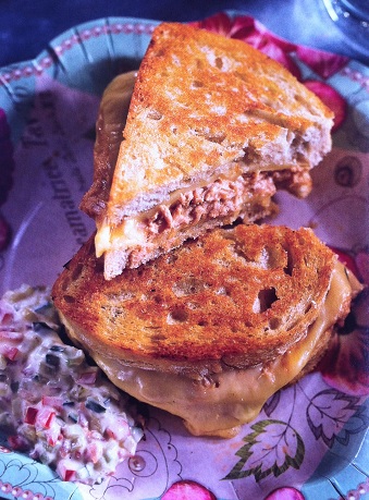 4. Bak de tuna melts in een grote koekenpan aan beide zijden, tot het brood goudbruin en krokant is en de kaas gesmolten. Serveer de tuna melts met het tomatenmengsel.