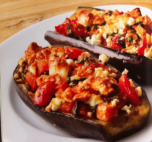 3. Mix in een schaal de tomaten, de basilicum, knoflook, scheutje olijfolie, een snufje zout en wat versgemalen peper. Schep dit mengsel in de aubergines tot aan de rand en bedek dit met de feta. Besprenkel dit met een beetje olijfolie.