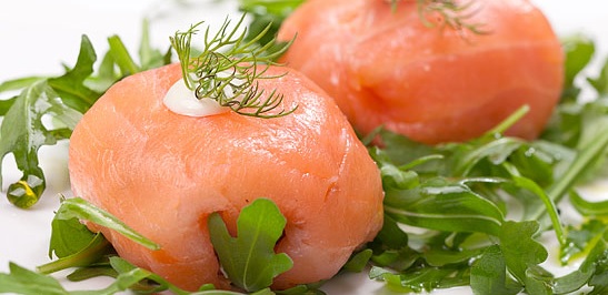2. Zet de ring op een bordje en schep hier 1/4 van het avocadomengsel in. Druk het zachtjes een beetje aan. Verwijder nu voorzichtig de ring en vouw hier een plak zalm omheen. Leg er nu wat rucola omheen.