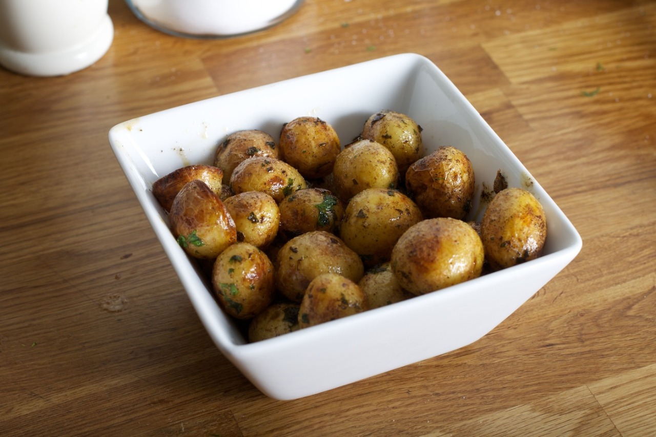 1. Breng een pan water aan de kook met wat (Himalaya-) zout. Was de krieltjes onder stomend water en voeg ze toe aan het kokende water. Zet het vuur lager en laat het zachtjes koken, ongeveer 15 minuten. Prik in de krieltjes om te kijken of ze gaar zijn.