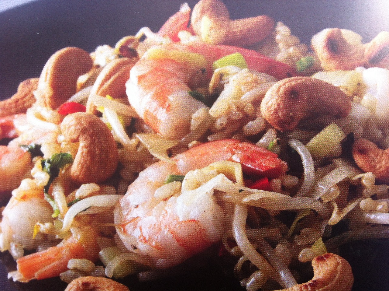 4. Voeg als laatste de gameba's toe en schep het geheel om zodat de gamba's roze en gaar worden.