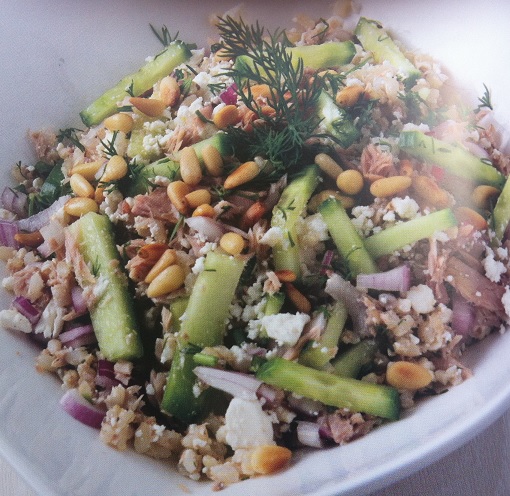 2. Snijd de ui heel fijn en strooi dit over het mengsel. Snijd de komkommer in hele dunne reepjes. Snijd de tomaten in kleine blokjes. Voeg de komkommer en tomaat ook toe aan het mengsel. Je kunt de pijnboompitten rauw toevoegen maar ook even bakken. Knijp een halve citroen boven het mengsel uit, let erop dat er geen pitjes in komen. Voeg nu de dille toe en maal er naar smaak verse zwarte peper over. Meng nu alles heel goed door elkaar.